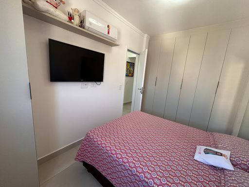Fica os moveis planejados e ar condicionado na sala e quarto.